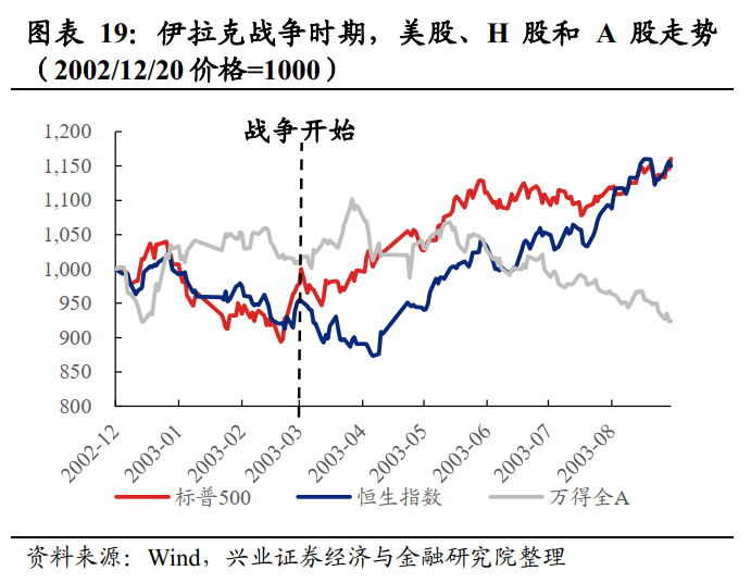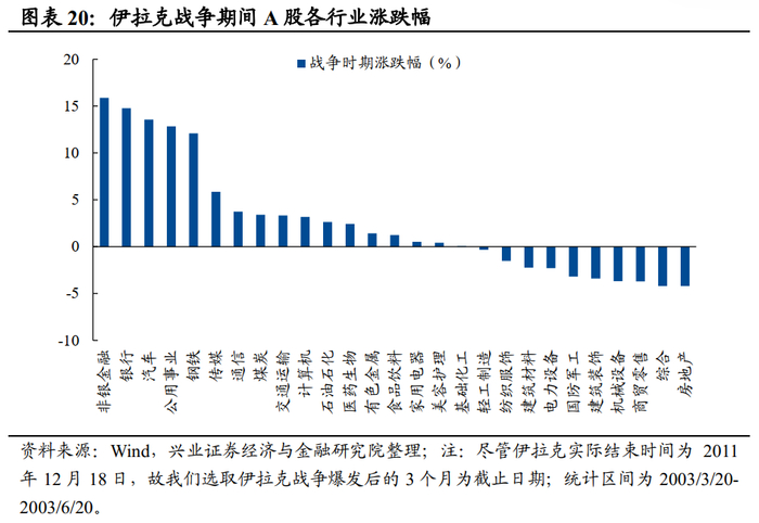 A股市场:整体上,伊拉克战争对A股影响较为有限。短期来看,截至4月15号(美军宣布伊拉克战争的主要军事行动已结束),A股开启一轮快速上涨,未受到全球风险偏好降低的影响。中长期来看,2003年4月-11月A股的调整主要与非典疫情的爆发和市场担忧因经济过热而出现的货币政策收紧预期所导致的。结构上,非银金融、银行和汽车表现较好,房地产表现靠后。2003年兴起的“价值投资”理念和彼时重工业的高速发展,催化了5朵金花行情,与伊拉克战争时期表现靠前的银行、汽车、钢铁、公用事业板块吻合度较高。