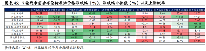 短期维度内,战争爆发前30天和战争开始后的5天,原油涨幅较为明显。战争爆发前原油价格涨幅较高可能是因为有投机资金提前凭借战争预期以炒作原油价格,但随着开战时点的临近,预期的兑现使部分提前炒原油的资金开始兑现浮盈。战争爆发后原油短期的上涨或是因为市场担忧因战争爆发而出现原油供给缩小的情况,因此主战场不生产原油的战争爆发后(阿富汗战争和俄罗斯-格鲁吉亚战争),原油价格并没有出现大幅抬升的现象。