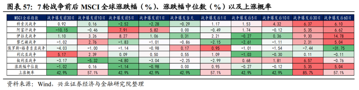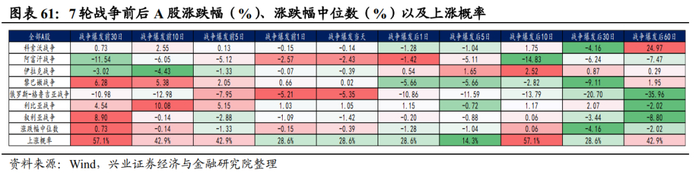 整体来看,战争爆发对于A股的影响主要体现在短期的情绪面冲击。复盘近30年几轮战争后,数据显示战争爆发前1天到后5天,A股的胜率和赔率均低于全球股票市场。