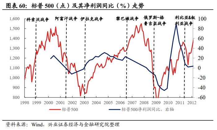 但长期来看,美股的定价权在分子而非分母,不影响美股基本面的战争难改变美股趋势。复盘7轮战争时期,战争的爆发并未扭转标普500的净利润此前的趋势,而由于盈利对美股涨跌幅的贡献大于估值,导致近30年内的战争对美股的长期影响较为有限。
