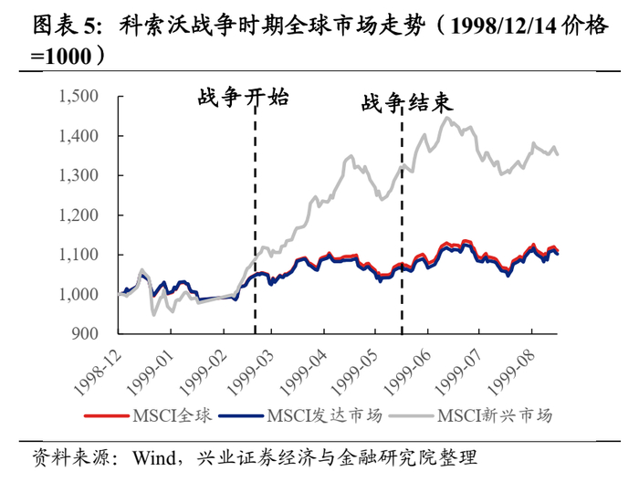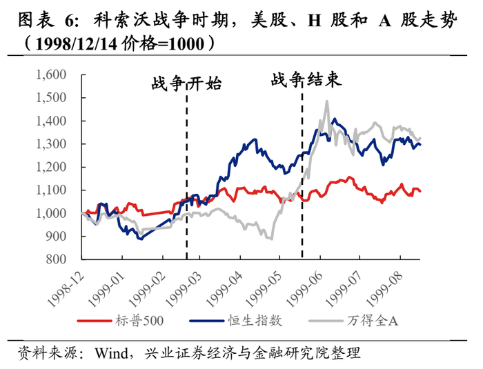 A股市场:整体上,科索沃战争在初期对A股有一定影响。考虑到我国与南斯拉夫关系较好,故科索沃战争的爆发在一定程度上压制了A股的情绪,5月10日当天上证指数大跌4.4%。但在一大批券商开始增资、央行宣布降息、降准等利好事件的推动下,A股开启“5.19”行情。