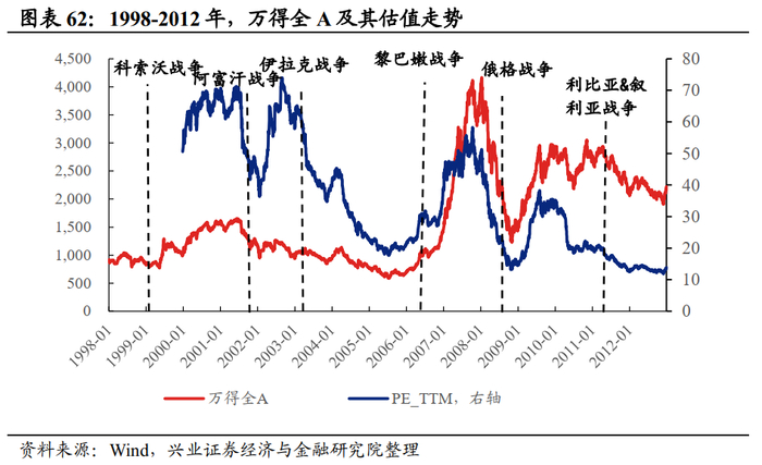 中长期来看,战争不会改变中国股市的的趋势,A股受内生因素主导。从估值和盈利两个维度去看,阿富汗、伊拉克、俄罗斯-格鲁吉亚、叙利亚和利比亚战争时期,A股处于戴维斯双杀阶段,黎巴嫩战争时期,A股处于戴维斯双击阶段。而战争的爆发并未改变A股的估值或盈利走势,这也就意味着其对于A股中长期的影响较为有限。