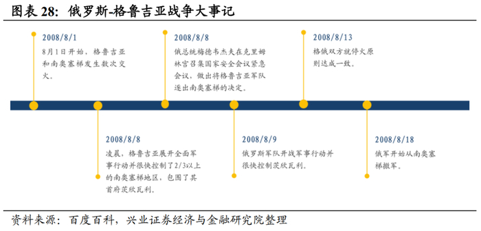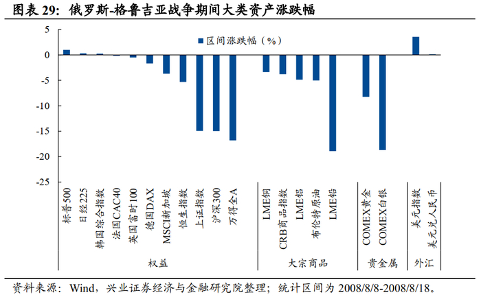 整体来看,俄罗斯-格鲁吉亚战争期间,美元表现最好,权益资产、大宗商品和贵金属普遍有所回调。