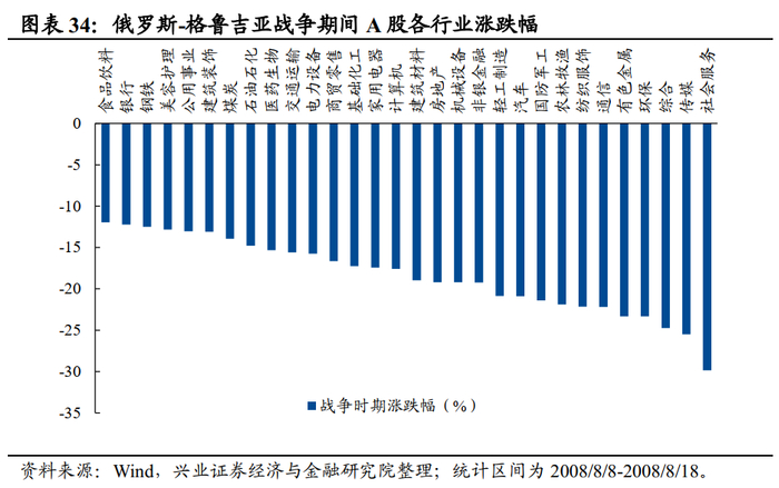 A股市场:战争对股市短期有一定冲击,但国内滞胀的经济环境才是导致A股回调显著的根本原因。俄格战争爆发当天,A股下跌5.4%,好于俄罗斯RTS指数,但显著跑输其他国家股市,这可能与我国与俄罗斯接壤故受到的情绪冲击较大有关。拉长来看,本轮战争期间A股的大幅回调主要是因为经济下行叠加PPI同比破10%,而非是战争带来的避险情绪所导致的。结构上,食品饮料和银行等板块的抗跌则主要是受益于熊市中的防御属性和抗通胀属性。由于俄格战争处于次贷危机导致的全球经济衰退期,A股处于熊市中,因此盈利和现金流相对稳定的食品饮料、银行和钢铁行业表现靠前。