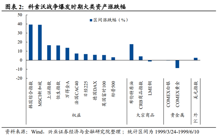整体来看,科索沃战争时期,以亚太股市为代表的权益资产表现较好,原油同样录得较高的涨幅,黄金价格初期上涨,但后期有所回落。