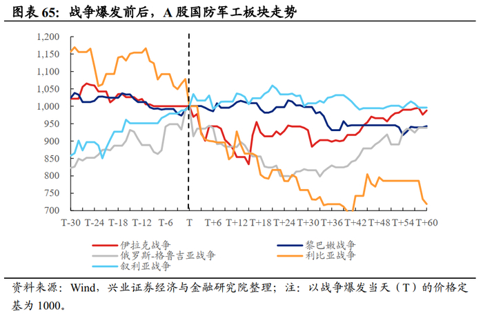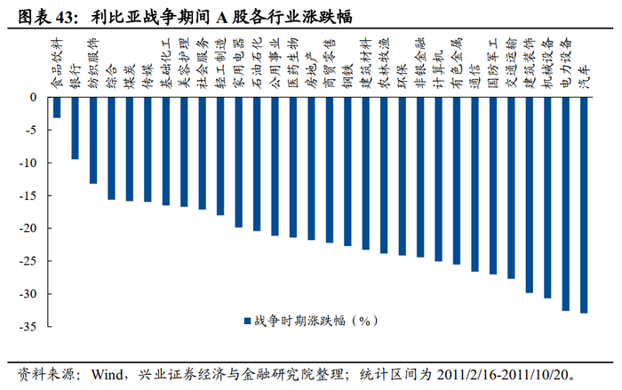 A股市场:整体上,利比亚&叙利亚战争对A股有间接的负面影响。战争爆发前后10天,A股均录得正收益,或指向战争对A股的情绪冲击有限,但是由于两次战争推动原油价格和通胀预期走高,并最终导致央行继续收紧货币政策,2011年4月中旬起,A股持续下跌。结构上,两轮战争时期,食品饮料和银行相对抗跌。2011年经济增长放缓且通胀压力高企,企业盈利下滑(2011年工业企业利润同比较上年下滑37.9%),市场整体处于下行阶段,故ROE仍在上行的银行和食品饮料板块凸显出明显的防御属性。A股的行业表现整体与战争的相关性较低,以国防军工板块为例,仅利比亚战争爆发的10天内国防军工板块出现明显的超额收益,但之后明显回落。