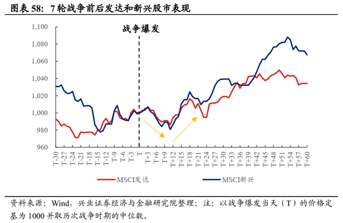 短期维度内,战争对股市存在一定扰动,但战争爆发后的30天内,权益资产V型反弹的概率较高。战争的爆发确实会使资金因为避险因素而流出风险资产,但在战争局势明朗后,随着风险偏好回暖,资金大概率将回流股市。其中,新兴市场的反弹力度高于发达市场。