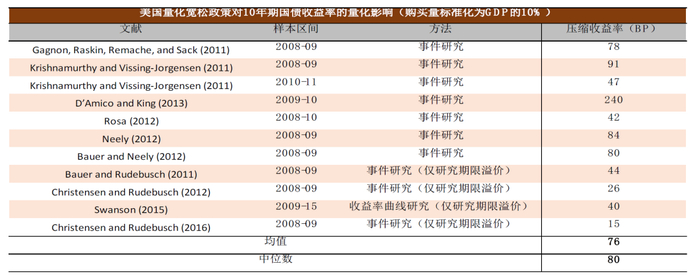 图表9:文献梳理QE对十年期美债收益率的量化影响估计