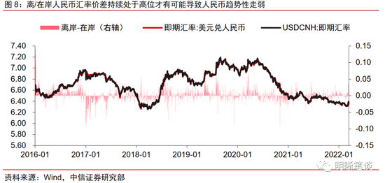 离/在岸人民币汇率价差反映出人民币贬值预期出现苗头,但尚未形成持续性,因而暂无需过度担忧。拉长时间维度来看,自2015年的“8·11”汇改之后,人民币持续走弱一般会伴随着持续多日的、较大幅度的离/在岸价差。例如:12020年3月4日-23日,美元兑人民币即期汇率从6.93快速升至7.12。期间累计14个交易日中共有10个交易日出现离/在岸人民币汇率价差持续超过100个基点的情况,其中6个交易日的价差在200个基点以上;22021年2月25日-3月8日,美元兑人民币即期汇率从6.45升至6.52。期间8个交易日内共有6个交易日出现离/在岸人民币汇率价差持续超过100个基点的情况,其中5个交易日的价差在200个基点以上。因此,当前离/在岸人民币汇率价差能否持续高位仍然需观察,暂时无需过度担忧。