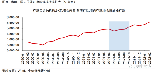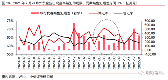 贸易顺差尚未完全转换为结售汇顺差,若人民币汇率有所走弱,也会伴随着外贸企业逢高结汇,从而为人民币形成支撑,削弱单边贬值趋势。从市场供需来看, 参考2021年7月-9月情况,在2021年5月31日央行上调外汇存款准备金率后,美元兑人民币即期汇率在整个6月均持续回调,人民币的贬值为外贸企业结汇带来了机会。因此7月-9月外贸企业出现逢高结汇的现象,非金融企业的境内外汇存款规模有所下行,结售汇顺差规模走阔。旺盛的结汇需求为人民币形成支撑,同期美元兑人民币即期汇率止跌并进入震荡区间。站在当前时点,由于今年1-2月的出口表现仍具韧性,高位的贸易顺差使得国内的外汇存款规模持续扩大,企业逢高结汇需求仍然偏高,这将为人民币需求形成支撑。