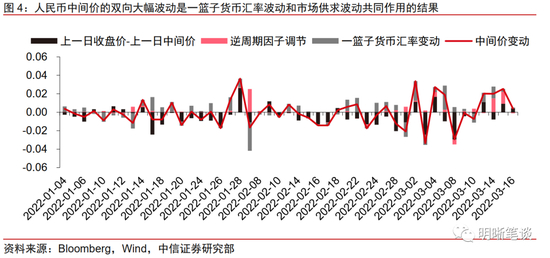 拆解后发现:(1)2月28日-3月17日期间,一篮子货币汇率变化和外汇市场供需状况是近期人民币中间价的双向大幅波动的主要原因;(2)近期人民币的贬值压力也来自于中间价超预期调整。3月14日和3月15日,潜在的逆周期因子成为影响当日中间价的主要因素,人民币中间价上调幅度超出市场预期,也导致了当日人民币出现大幅回调。