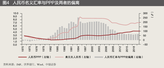 近几年的通胀疲软可能更多来自经济结构调整和债务化解引发的有效需求不足。市场也不乏“货币空转”的讨论。这并非本文重点。本文仍以价差最终收敛为情形进行分析。此处以中美央行的通胀目标差异作为判断PPP长期走势的依据,即美联储2%和中国人民银行2%~3%的通胀目标均能成功实现。这将使得人民币PPP继续贬值。如果以PPP每年1%的贬值效率来计算,2045年以后人民币PPP就会破7。因此,即便人民币名义汇率维持在当前水平,25年左右的时间可能也会彻底收敛。