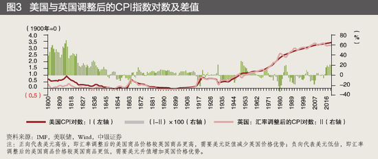 英国和美国均拥有较长的历史数据,从而提供了观察和分析平价理论在不同经济发展阶段表现的机会。本文借用AlanTaylor和Mark Taylor的方法处理英美的汇率和通胀数据。对美国的通胀率,直接建立以1900年为基期的指数,并对通胀指数采取对数处理以平滑趋势;对英国的通胀率,首先将其CPI指数与名义汇率相乘,获得美元计价的英国CPI指数,然后进行相同的基期和对数化处理。如果PPP理论有效,两国通胀走势应该基本上一致;如果经汇率换算后的英国CPI低于美国CPI,说明英国商品价格更低,需要英镑升值或美元贬值来拉近两国的物价差距;反之则需要相反的操作。