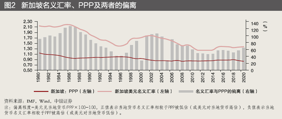 不过,并非所有发达国家都可以做到价差收敛,新加坡就是一个例外,且具有较好的启示意义。新加坡是IMF定义的发达经济体,而价差走势却与发展中国家类似。进一步看,新加坡的通胀长期低于美国,使得PPP呈缓慢升值趋势,加上参考篮子货币的有管理浮动(相当于反向盯住美元指数),令美元兑新加坡元汇率与美元指数呈现同涨同跌的走势(见图2)。这也造成了美元指数在一定程度上能够决定新加坡价差的收敛进度。至于未来新加坡价差走势如何,则需要看美国能否摆脱制造业“空心化”,减少进口依赖。目前来看,较强的美元有助于减少美国的进口成本,可能更适合美国少生产多消费的经济模式。