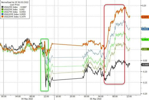 5月5日周四,在美联储宣布2000年以来的最大加息幅度之后一天,美股完全抹去了上日涨幅并进去“崩跌”模式,10年期基准美债收益率也扭转昨日跌幅而再度升破3%,触及三年半最高。