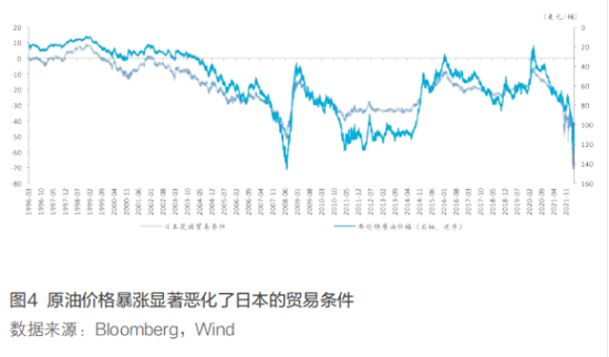 最后,俄乌冲突事件本身对日本也有波及。一方面,俄乌冲突推动能源价格高涨,日本国际收支进一步恶化。日本能源结构高度依赖油气资源,根据美国能源信息署的数据,2020年日本对油气的依赖度高达63%。俄乌冲突再度推升原油价格,3月7日,布伦特原油飙升至123.21美元/桶,显著恶化了日本的贸易条件,日本花旗贸易条件在当日下行至-70.57,创历史新低(见图4)。贸易条件的恶化进一步冲击了日本的国际收支,根据IMF数据,日本外汇储备也较2020年底下滑了295亿美元。另一方面,此次冲突对日俄双边关系也有扰动。俄日长期存在关于“南千岛群岛”(日方称为“北方四岛”)的地缘争端,此次俄乌冲突后日本紧随欧美对俄实施单边制裁,导致俄罗斯停止与日本的和平条约谈判,俄方即将退出双方共同参与的南千岛群岛经济活动。