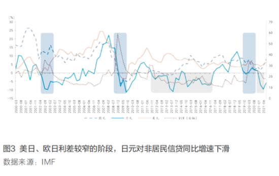 多因素导致了近期日元避险属性的弱化。首先,新冠肺炎疫情以来,全球“大放水”使得美日、欧日利差快速收窄,日元套利融资货币定位受到冲击,这是本轮日元“避险属性”趋弱的主因。2020年3月以来,美联储重启量化宽松政策,导致欧洲美元市场上美元隔夜拆借利率迅速滑落至低位,美日利差大幅收窄。与此同时,欧央行仍维系了负利率政策,并开启新一轮资产购买计划刺,导致欧日利差进一步走低。相对其他流动性更高的套利融资货币美元与欧元,日元失去低息优势后,套利交易不再依赖对日元的拆入。根据IMF数据,2021年第三季度,日元对非居民信贷增速降至-5.8%,而美元与欧元对非居民信贷则加速增长(见图3),套利融资货币地位出现了此消彼长。事实上,在前一轮欧美货币宽松阶段也曾出现过类似的情况。2012—2014年,VIX指数与日元汇率相关性显著走弱,VIX的四次飙升均未带来日元的大幅升值,这与Yuki(2017)对于日元避险属性变化的发现一致。