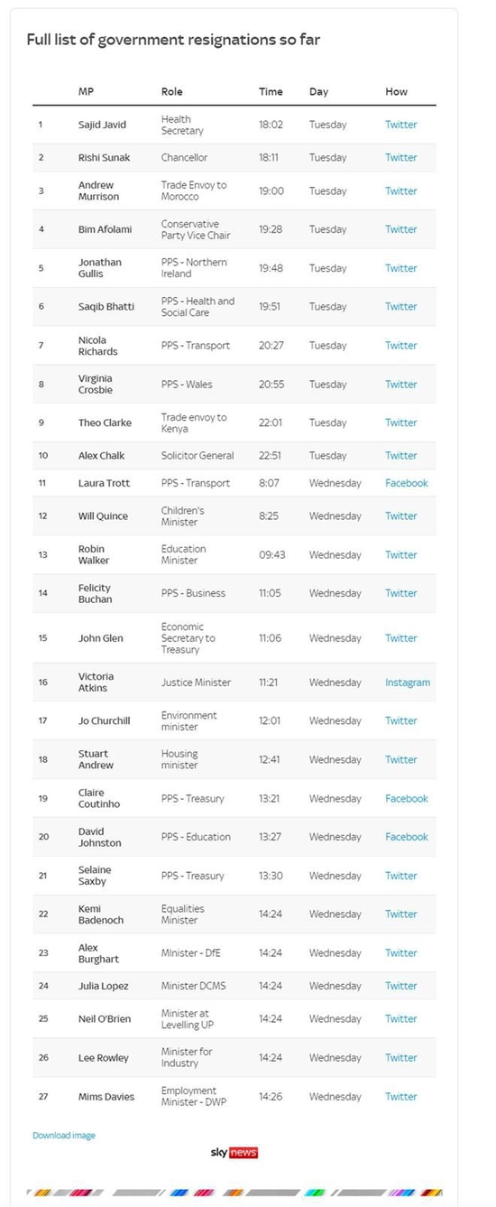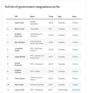 哈特辞职报道发布前,据英国媒体下图统计,本周二全天和周三不到一天时间,已有共计31名约翰逊政府的成员辞职。