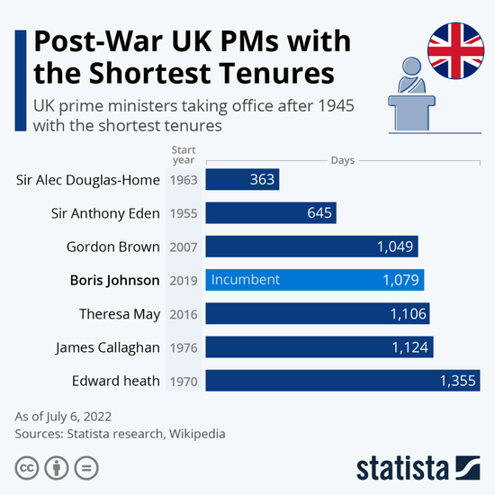 据Statista Research统计估算,如果约翰逊在一个月内辞职,他将成为史上任期最短的英国首相之一,在1945年以来历任辞职首相的最短任期排名中位列第四。