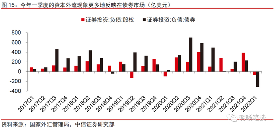 海外加息潮通过资本流动渠道对人民币造成的整体冲击偏弱,但需警惕强美元给人民币带来的被动贬值压力。此前,海外经济体陆续收紧货币政策,而中国国内的货币政策仍然维持相对宽松取向,国内外货币政策呈现分化,最为直接的表现便是中美利差收窄并阶段性走向倒挂,来自资本外流的压力在一定程度上驱动人民币走弱至6.7附近震荡运行。从国际收支角度来看,今年一季度的资本外流现象更多地反映在债券市场,“证券投资:负债:债券”项录得319亿美元的流出规模。对此,我们认为单一口径的资本外流对人民币汇率的冲击有限。随着国内局部地区疫情的好转,以及各类“稳增长”政策的落地和实行,国内基本面回暖、A股市场外资持续流入,后续资本流出给人民币带来的压力不大。海外方面,美联储仍有较大可能继续大幅加息,美元或仍将偏强运行一段时间,短期内人民币仍需警惕来自美元指数所带来的被动贬值压力。