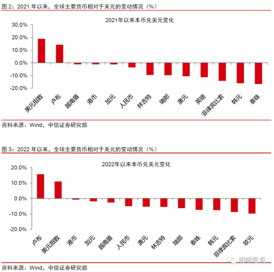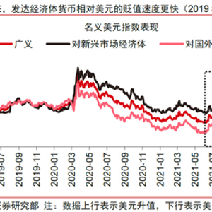 资源国货币和贸易顺差国货币相对表现更佳。2021年至今,美元指数表现强劲,涨幅高达19%。其中,2022年以来,在地缘政治冲突冲击全球风险偏好、美国步入加息周期等因素的共同作用下,美元指数上涨11%,并于7月初一度突破107这一2003年以来的历史高位。在美元强势的背景下,对比全球主流货币兑美元的变动情况:(1)俄罗斯、澳大利亚、加拿大等主要资源出口国货币偏强运行;(2)主要贸易国中,中国和越南由于仍保持一定的贸易顺差,本币相对表现不差,而韩元、泰铢等货币相对于美元贬值明显;(3)俄乌冲突持续发酵以及与美国货币政策的分化,推动欧洲主流货币以及日元等同样表现较差。