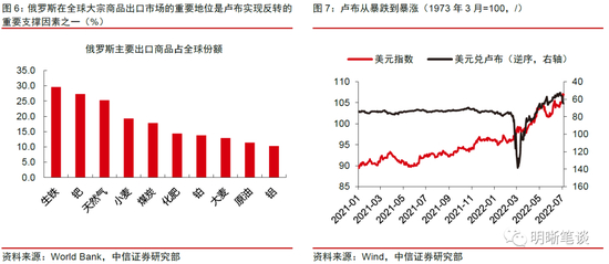以俄罗斯为例,其在大宗商品市场的重要地位是卢布在俄乌冲突爆发后两极反转的重要支撑因素之一。俄乌危机爆发后,以欧美为首的国家对于俄罗斯的多项制裁措施导致全球对于俄罗斯资产的风险偏好快速走低,引发卢布大幅走贬,美元对俄罗斯卢布的即期利率在2022年3月7日触及138.5的历史高位。对此,俄罗斯一方面通过加息、资本管制等抑制资本外逃;另一方面,凭借其在全球大宗商品市场的重要地位,俄罗斯政府在大宗商品领域采取了一系列的反制裁措施,例如以卢布作为“不友好国家”购买天然气的结算货币(央视财经报道)、将谷物/葵花籽油/油籽粕的出口关税以卢布结算(央视财经报道),对卢布币值形成了较大支撑。通过上述一套“组合拳”,卢布重回涨势,截至2022年7月8日美元兑卢布即期汇率降至65,甚至大幅低于俄乌危机爆发前73.7的平均水平,卢布也实现了从暴跌到暴涨的“两极反转”。