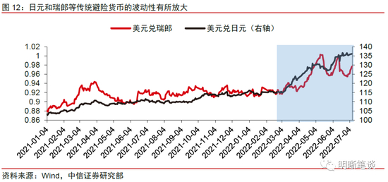 由于美元强劲,日元和瑞郎等传统避险货币的波动性有所放大,地缘政治冲突下的避险属性并不明显。2021年年中以来,美元指数进入上行通道,在2022年2月24日俄乌冲突爆发以前,美元指数已连续多月在95关口以上运行。俄乌危机爆发后,全球市场的避险情绪快速升温,避险需求驱动资金流向美元、美债、黄金等避险资产。相较于美元的走高,传统避险货币中的日元和瑞郎则表现平平,并未因市场恐慌而出现显著升值。随后在全球通胀形势日益严峻、美联储拉开加息序幕的背景下,日元由于日央行坚持宽松以及日本陷入贸易逆差而持续走贬;瑞郎同样呈现走弱趋势,虽然瑞士央行宣布加息50bps以应对国内通胀,但瑞郎表现仍然偏弱,且波动性显著增加。