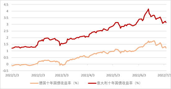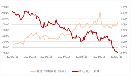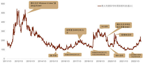 自今年年初意大利选举以来(详见《意大利总统的选举结果或带来新的不确定性》)意大利和德国10年期国债利差便开始一路走高,6月初欧央行会后这一利差一度走阔至2020年6月以来的新高240个基点附近,这也使得市场怀疑欧元区会出现又一个欧债危机的声音愈演愈烈(欧债危机期间,这一利差一度上涨至500基点左右,图1)。虽然此后随着市场对经济衰退的预期有所升温,欧债利率也随之普遍下行,这一利差也从高位有所回落,但上周四7月14号意大利总理德拉吉提交辞呈的消息 [1](详见下文)使得这一利差再次走阔至210基点附近。我们认为,导致这一利差走阔的主因是欧央行即将开启近10年来的首次货币政策正常化,而意大利自身经济较差的基本面和近期突发的政坛不确定性也加剧了这一利差的走阔,虽然这一关键利差的走阔对欧元的走势会产生不利影响,但我们认为欧央行有能力成功应对这一问题,而本周21号的会议就是欧央行应对此事的关键时点。