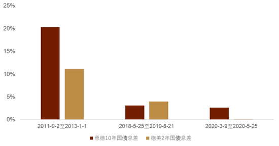 图表15:今年以来意德10年期国债息差走阔至不同程度对欧元/美元走势的影响
