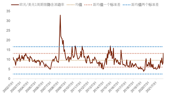 近期意大利政坛的意外动荡就可能会使新工具的潜在效果有所打折。7月14日,意大利总理德拉吉以内阁已经没有多数派(图表10显示最新意大利各政党支持率),支撑执政联盟政府的基础不复存在为由正式提出辞职[19] ,意大利德国国债利差应声上涨至200基点之上,而欧元也跌破了平价至2002年以来的新低点(图表11)。14日当天,意大利参议院投票通过帮助贫困家庭和企业面临高企能源价格成本的《援助法案》,而作为执政联盟中第二大政党的五星运动党(Five Star Movement)的参议员集体弃权没有投票。这成为了德拉吉要求辞职的导火索。早在投票前德拉吉就警告过[20] ,如果五星运动党不参与投票,这就相当于其反对他领导的联合政府,他将有可能考虑辞职。我们认为,表面上看,五星运动党只是反对上述《援助法案》中的一个有关在罗马设立垃圾焚烧炉的条款,因而导致其成员拒绝参加投票。但实际上,面临生活成本的高企和当下的能源危机,五星运动党一直批评意大利政府没有投入足够的资金帮助受到高能源价格打击的企业和家庭,并一直呼吁扩大赤字,这显然与德拉吉的改革政策方针直接形成冲突(详见《意大利总统的选举结果或带来新的不确定性》)。虽然在德拉吉递交辞职的一小时左右之后,总统马塔雷拉表示拒绝接受德拉吉的辞呈[21] 。并且邀请德拉吉在议会发表讲话,以评估政治局势和其他结盟政党对当前政府的支持(欧元也再次回到平价之上),但最悲观的情形下,如果德拉吉此后一再坚持辞职(或者他本周无法在议会获得多数党的支持),那么马塔雷拉也只能解散议会,意大利就可能最早在今年秋天提前选举,而这无疑会干扰意大利政府原定于今年秋季中旬通过最新预算案的计划,也会打乱欧央行设计和实施应对“碎片化”新工具的努力,同样可能令意大利无法从欧盟的复苏基金中获得资金(详见《意大利总统的选举结果或带来新的不确定性》),而以上这些无疑又增加了一个利空欧元的重要因素。本周初德拉吉将在国会发表讲话,市场也会密切关注德拉吉的最新表态,目前1周期限的欧元/美元隐含波动率已经大涨至2015年以来的高点并且接近欧债危机时的水平(图表12),这其中除了反映出市场对本周ECB会议的风险溢价之外,也在一定程度上预计了意大利政坛的不确定性给欧元带来潜在的波动。
