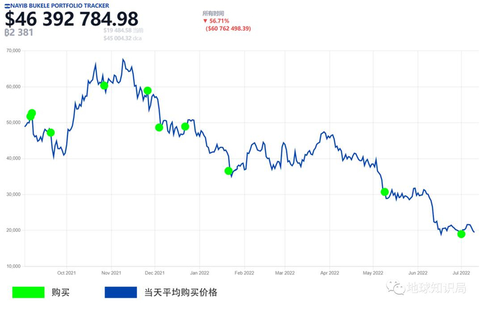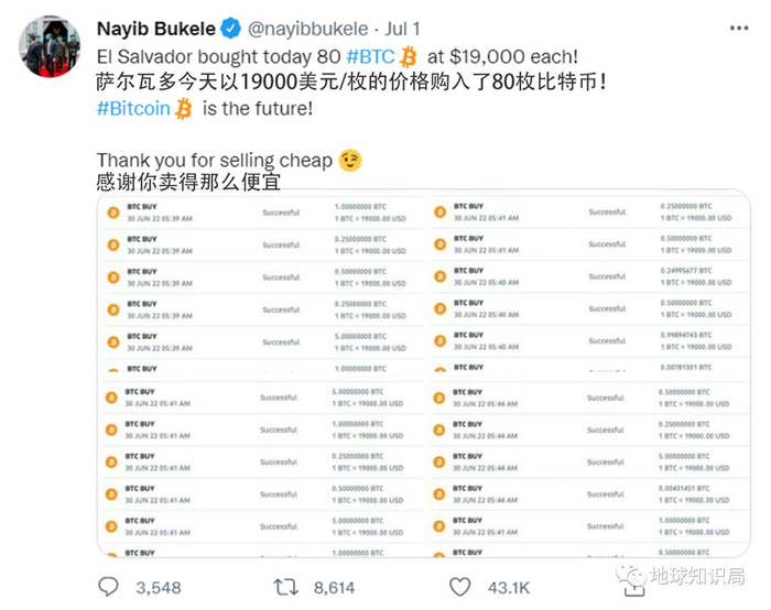 每次买入时,还会发推特告知全世界人民,赚足眼球。“漫长的等待,但值得!咱萨尔瓦多又买了420枚!”“刚刚,萨尔瓦多花了1500万美元买入410枚比特币,有些人卖得很便宜哦!”他甚至会在错过抄底后发一条评论:“淦,7分钟前错过最低价!”