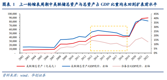 其次,如何估算美联储缩表的合意区间与节奏?由于目前美联储没有明确口径表露过合意的缩表规模或资产负债表规模,因此我们试图借助历史的缩表经验来进行假设。