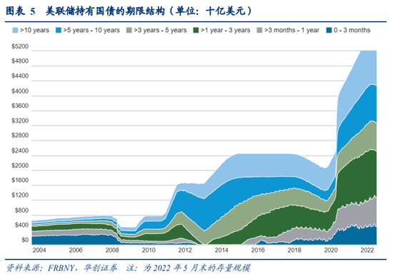 以2022年5月末存款规模计算,美联储目前持有的证券资产仍以国债与MBS为主,占比分别达到68%/32%,结构上约2:1。从期限结构来看,1年以上国债占国债总资产的比重为79%;而MBS则基本全部为5年以上期限。这一部分我们将基于目前美联储所持资产,估算未来的到期规模与节奏,来分析美联储是否需要主动出售资产以满足缩表需求。