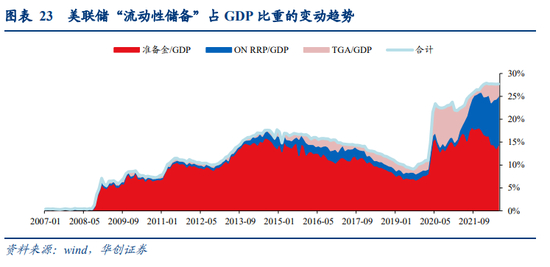 首先,理论上来说,由于ON RRP与TGA并不改变美联储的资产负债表规模,只改变负债端结构。简单说,ON RRP与TGA余额的扩大并不会带来美联储更多的流动性储备——非银机构与财政部即便不直接与美联储进行交易,也会间接带来银行存款提升并带来准备金规模提升,因此ON RRP与TGA只改变了市场流动性以何种形式存在于美联储。因此单独以当前ON RRP与TGA余额高来判断缩表对流动性冲击较小是不全面的。