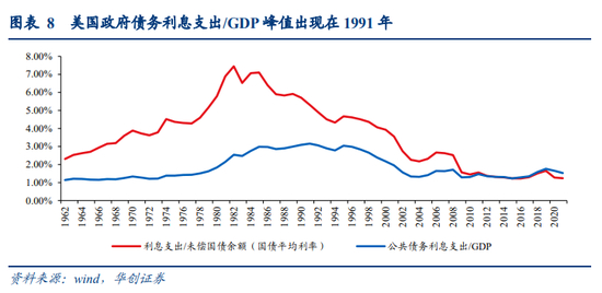 通过上述假设可推算缩表对美国债务利息的影响:截至2021年,美国政府公共债务平均利率为1.5%(联邦政府利息支出3523.4亿美元/政府公共债务余额23万亿美元)。此处我们简单假设:缩表2.5万亿美元对10Y国债收益率与其他期限国债收益率的影响相同(收益率曲线形态不变),即所有期限国债收益率均上行60bps。那么2022-2025年联邦政府利息支出将提升至5100亿美元以上,占GDP的比重提升至2%以上。历史上,公共债务利息支出占GDP比重的最高值出现在1991年,达到3.2%。目前,由于国债利率持续下行,尽管公共债务规模持续上涨,但债务利息支出占比反而持续下降,2021年为1.5%。而反过来估算,如果债务利息支出占GDP比重提升至历史最高值3.2%,则需要公共债务平均利率提升至3.3%,相比2021年1.5%的水平提升180bp。