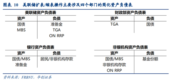 在对缩表过程中美联储资负表的变动进行估算前,我们先来厘清美联储的扩表与缩表操作的机制,即如何影响各部门的资产负债表。结合纽约联储对美联储扩表/缩表机制的解释[2],美联储的扩表与缩表操作主要涉及四个部门:美联储、美国财政部、商业银行、非银机构(如个人、货币市场基金MMF等)。为刻画扩表/缩表的影响,我们将四部分的资产负债表简化如下: