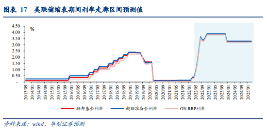 ON RRP与准备金方面,根据CBO对美国未来4年公共债务规模的预测(见报告第二章),美国财政部大概率会将到期的国债进行滚续,并进一步扩大债务规模。由于美联储不再扩表,因此续发与新发国债均将由银行、非银金融机构购买。货币市场基金等非银机构主要以减少ON RRP投资进行融资、银行与部分非银机构通过减少准备金/存款进行融资。假设缩表的尾声,非银机构超额流动性基本完全被回收,ON RRP规模回落至疫情前水平,即由目前的2.26万亿美元缩表2万亿美元至2600亿美元;而对应准备金规模则需由目前的3.32万亿美元缩表1.37万亿美元至1.95万亿美元。