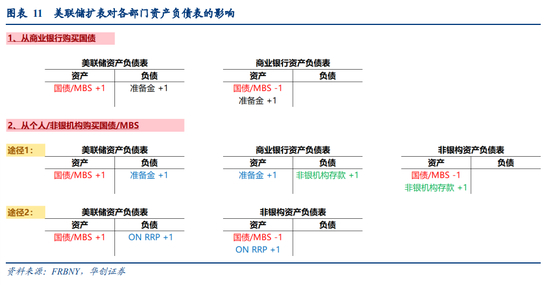 美联储扩表需要向银行/非银机构购买国债/MBS资产。向银行购债时,美联储增发货币带来商业银行准备金增长1美元,同时商业银行出售国债/MBS后资产端减少1美元证券;美联储资产端则增加1美元证券。向非银机构购债时,同样带来非银机构资产端减少1美元证券,美联储资产端增加1美元证券;不过,由于非银机构不能向美联储存放准备金,而可与美联储进行ON RRP交易,因此非银机构出售证券资产后,可能带来非银机构存放在银行的存款增加,进而带来准备金增加;或可能带来非银机构与美联储的ON RRP交易增加。