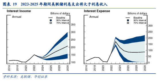 另外,美联储在最新的研究[3]中也对潜在的亏损风险进行了估算,结论显示在2023-2025年美联储有较大的亏损风险。在美联储的研究假设中,基准假设为美联储SOMA持有量从2022年的8.5万亿美元下降至2024年的6.3万亿美元,此后资产负债表保持一段时间稳定,并未长期重新启动扩表;同时准备金与ON RRP规模大致降至2017年缩表前水平。对联邦基金利率的假设为2023年末加息至最高水平3.8%,在2025年前维持3%以上水平。根据上述假设得到的结论为:在缩表期间,利息收入短期将下降,同时利息支出将大幅提升,从而导致2023-2025年期间美联储净收入转负。