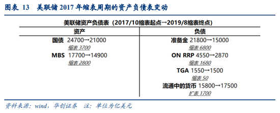 在梳理了缩表操作如何影响资产负债表后,我们回顾2017年缩表周期中美联储资产负债表的变动情况。2017年-2019年期间,流通中的货币增长1700亿美元、TGA账户余额减少50亿美元,带来准备金规模被动缩小1650亿美元。美联储国债与MBS分别缩表3700/2800亿美元,带来非银机构ON RRP规模缩小1680亿美元、银行准备金规模累计缩小6800亿美元。