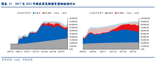 本轮缩表与2017年最大的不同之一在于美联储负债端除了大量的准备金外,还有大量的隔夜逆回购ON RRP,这意味着在本轮缩表周期的起点,美联储的“流动性储备”是远高于2017年的。2017年缩表前,美联储负债端有2.2万亿美元准备金,而ON RRP与TGA账户余额分别为4550/1550亿美元,规模较小。而本轮缩表周期前,美联储负债端准备金规模3.32万亿美元,同时ON RRP与TGA账户余额分别达到22600/8000亿美元。