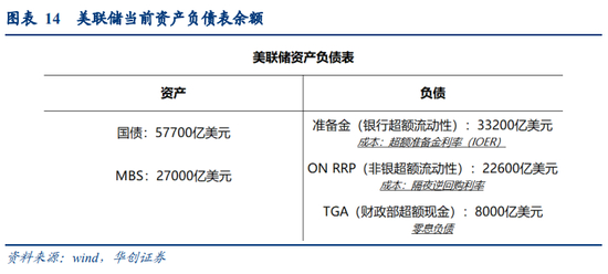 美联储:资产端主要为国债与MBS;负债端主要包括银行持有的准备金、财政部在美联储的存款(TGA)、非银机构如货币市场基金持有的ON RRP余额。