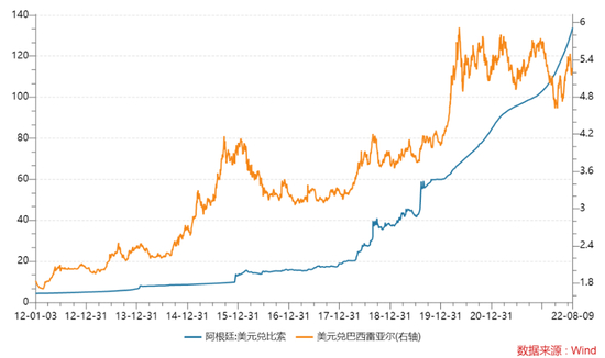 由于巴西和阿根廷在农产品出口方面存在竞争,货币层面巴西雷亚尔和阿根廷比索货币一直呈现“亦步亦趋”的走势,巴西雷亚尔贬值时,为了避免在出口上处于不利地位,阿根廷比索也倾向于贬值,但显然受限于国内经济形势,阿根廷比索并不具备跟随贬值的底气。
