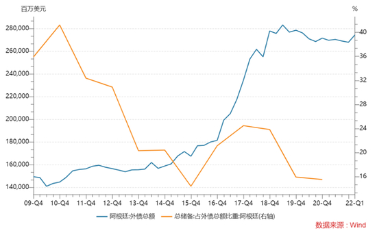 阿根廷统计局数据显示,截至2022年一季度,阿根廷外债总额为2744亿美元,但其外汇储备仅428亿美元,完全处于资不抵债的状况。