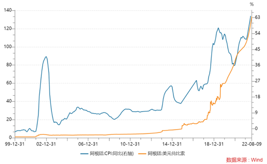 过去的数十年的时间里,阿根廷一直在同两位数的高通胀率做顽强对抗,今年6月阿根廷CPI同比升至64%,与此同时阿根廷比索兑美元汇率一路跌至133的历史低点。