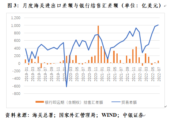 从海关贸易顺差变成贸易结售汇顺差,要经过银行代客涉外收付和代客结售汇两个环节。从第一个环节银行代客涉外收付看,不论与上年同期,还是与五年趋势值相比,海关贸易顺差转化为银行代客货物贸易收付顺差的漏损都是比较少的。按照海关可比口径,今年前7个月,出口少收入971亿美元,进口多支出863亿美元,贸易顺收小于顺差1834亿美元,相当于海关进出口顺差38.0%,同比下降3.5个百分点,较2017~2021年趋势值下降17.4个百分点(见图1)。