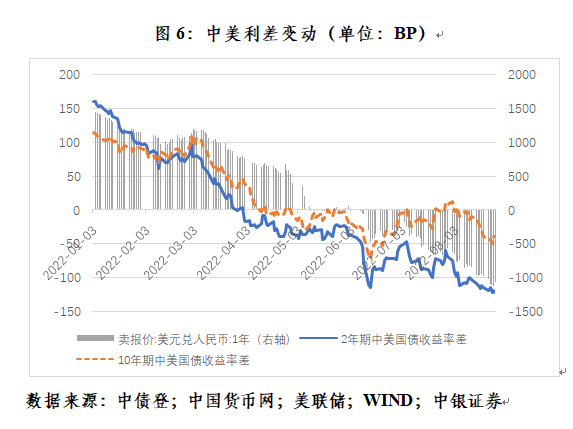 三是中美利差倒挂加深。当市场纠结美联储9月份议息会议是加息50还是75BP之际,8月15日中国人民银行超预期下调1年期MLF和7天逆回购利率各10BP,8月22日1年期和5年期LPR利率分别下调5和15BP。在中美货币政策分化加剧的背景下,8月15~26日,日均2年期和10年期中美国债收益率差分别为-117和-35BP,分别较8月1~12日日均水平扩大17.0%和945.2%;日均1年期美元兑人民币远/掉期点子为-1029BP,增加32.5%(见图6)。外汇市场似乎对通胀美高中低,中美实际利差为正的“利好”并不买账。