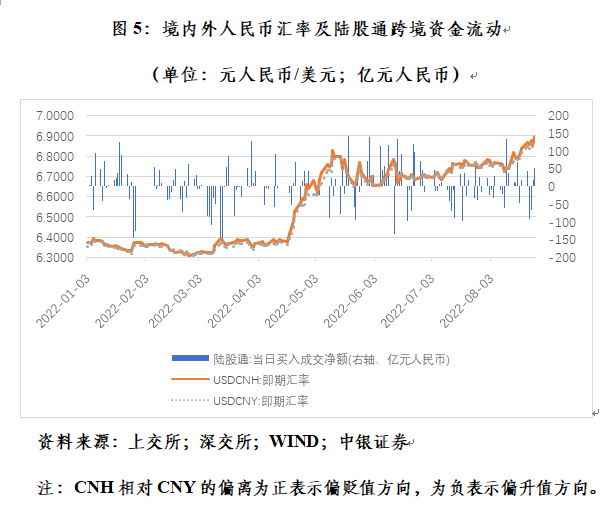 二是国内经济反弹受阻。8月12日和15日先后公布的7月份中国金融和经济数据弱于预期,反映国内再现多地疫情散发和南方高温天气造成的新冲击。受此影响,8月15~26日,陆股通项下累计净买入12亿元,较8月1~12日下降80.8%;CNH相对CNY持续偏弱,日均差价由+58BP增至+178BP(见图5)。