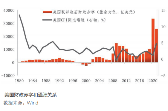 法案削减赤字规模不大,对抑制通胀可谓“杯水车薪”。2008年之前,美国财政赤字规模相对有限,而全球金融危机之后,随着美国财政政策货币化操作增加,美国财政赤字大幅攀升。美国财政赤字与通胀之间关系也在2008年前后发生明显变化,在2008年之前,由于财政赤字规模较小,财政赤字对通胀的影响较弱,2008年之后随着财政支出规模增加,二者联动性明显增强,走势高度相关(见附图)。2021财年美国财政赤字高达2.8万亿美元,预计2022财年将降至1万亿美元,虽然法案实施预计会降低财政赤字约3000亿美元,但这将在未来10年发挥作用,每年减少300亿美元赤字对抑制通胀的作用有限。美国国会预算办公室数据显示,未来十年美国财政赤字累计将达到14.5万亿美元,法案削减的赤字占比仅为2.1%,缓解财政赤字作用微乎其微。而且,法案是否能够削减赤字依然存疑,如果2022年美国经济再度陷入衰退,美国政府可能会继续加大财政刺激力度,赤字规模将再次走高。
