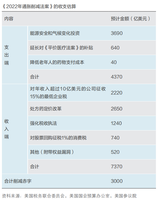 从收入端看,主要通过对大公司和富人增税、强化税收执法和处方药定价改革等措施来筹集资金。一是对年收入超过10亿美元的公司设定15%的最低税率,这将带来2200亿美元财政收入。2017年特朗普政府将美国企业税率从35%大幅降至21%,大企业可以通过税收减免、抵扣和税务规划等方式减少纳税,实际税率远低于21%。数据显示,2020年耐克、联邦快递、惠普、杜克能源等美国55家上市公司合计税前所得为405亿美元,但纳税额为-35亿美元,合计有效税率为-8.6%,而且其中至少有26家连续三年未缴纳过联邦所得税。通过对大公司设定15%最低税率,可以在一定程度上改善财政收入。二是对股票回购征收1%消费税。美股在全球金融危机后保持十余年上涨,一定程度上得益于上市公司对自家公司股票的回购。据统计,2019—2021年间,罗素3000指数(包含美国3000家最大市值公司股票,以加权平均方法确定指数)成分股共回购2.5万亿美元股票,扣减1万亿美元的新发行股票抵税额,需要纳税部分为1.5万亿美元,对应150亿美元税收。随着股票回购税落地,上市公司可能更加谨慎处理手中持有的现金,可能减少股票回购而转为分红派息,对股票回购征收消费税所带来的财政收入增幅可能低于美国政府预计的740亿美元。三是强化税收执法。美国财政部估计,收入最高的1%人群每年逃税规模约为1600亿美元,约占每年未缴税款总额的28%,因逃税带来的财政收入损失约相当于美国国内生产总值的3%。法案将向国家税务局增加800亿美元预算,帮助打击逃税行为。四是对处方药进行定价改革,允许政府通过谈判降低处方药价格,如果未来制药巨头将医保药品价格提高到超过通胀率的水平,允许政府向其征收通胀“回扣”。处方药定价改革和《平价医疗法案》功能类似,可降低药品价格,改善居民医疗费用,特别是降低参加医疗保险的老年人看病成本,将自付费用上限限制在每年2000美元。预计改革将节省财政开支2650亿美元。